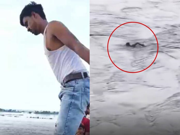 একটি ভাইরাল ভিডিওতে ধরা পড়েছে, এক তরুণ নদীর জলে ঝাঁপ দেন উঁচু জায়গা থেকে। চারপাশের কয়েকজন তাঁকে উত্সাহ দিয়ে চিৎকার করছিলেন। শুরুতে তিনি সাঁতরে কিছুটা দূর পর্যন্ত গেলেও পরে সমস্যায় পড়েন। নদীর প্রবল স্রোতে আটকে গিয়ে আর এগোতে পারেননি।