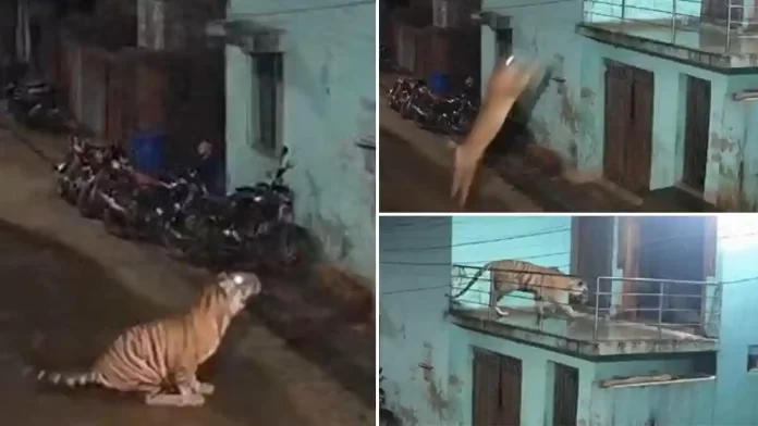 ভিডিওতে দেখা যায়, রাস্তায় হাঁটছিল বাঘটি। হঠাৎই এক ঝটকায় পেছনের পায়ে ভর দিয়ে লাফিয়ে উঠে যায় একেবারে দোতলায়। কোনও ধাক্কা বা গতি কমানো ছাড়াই বাঘটি সহজেই বারান্দায় পৌঁছে যায়। এরপর কিছুক্ষণ বারান্দায় দাঁড়িয়ে চারদিক তাকিয়ে দেখে, তারপর হঠাৎ করেই অদৃশ্য হয়ে যায় ফ্রেম থেকে।